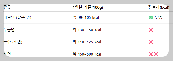 👉 메밀면은 국수 중에서도 칼로리가 낮은 편이에요! 😊